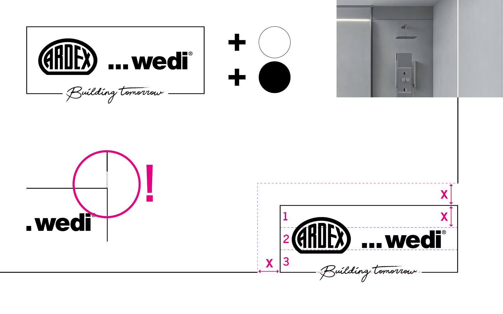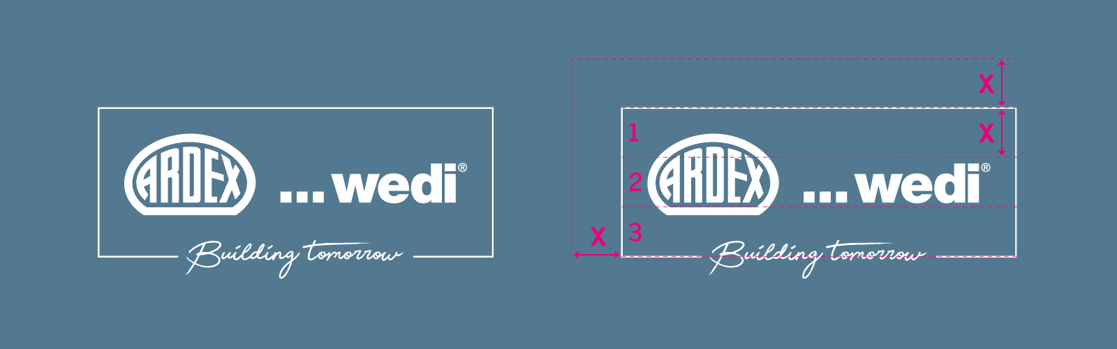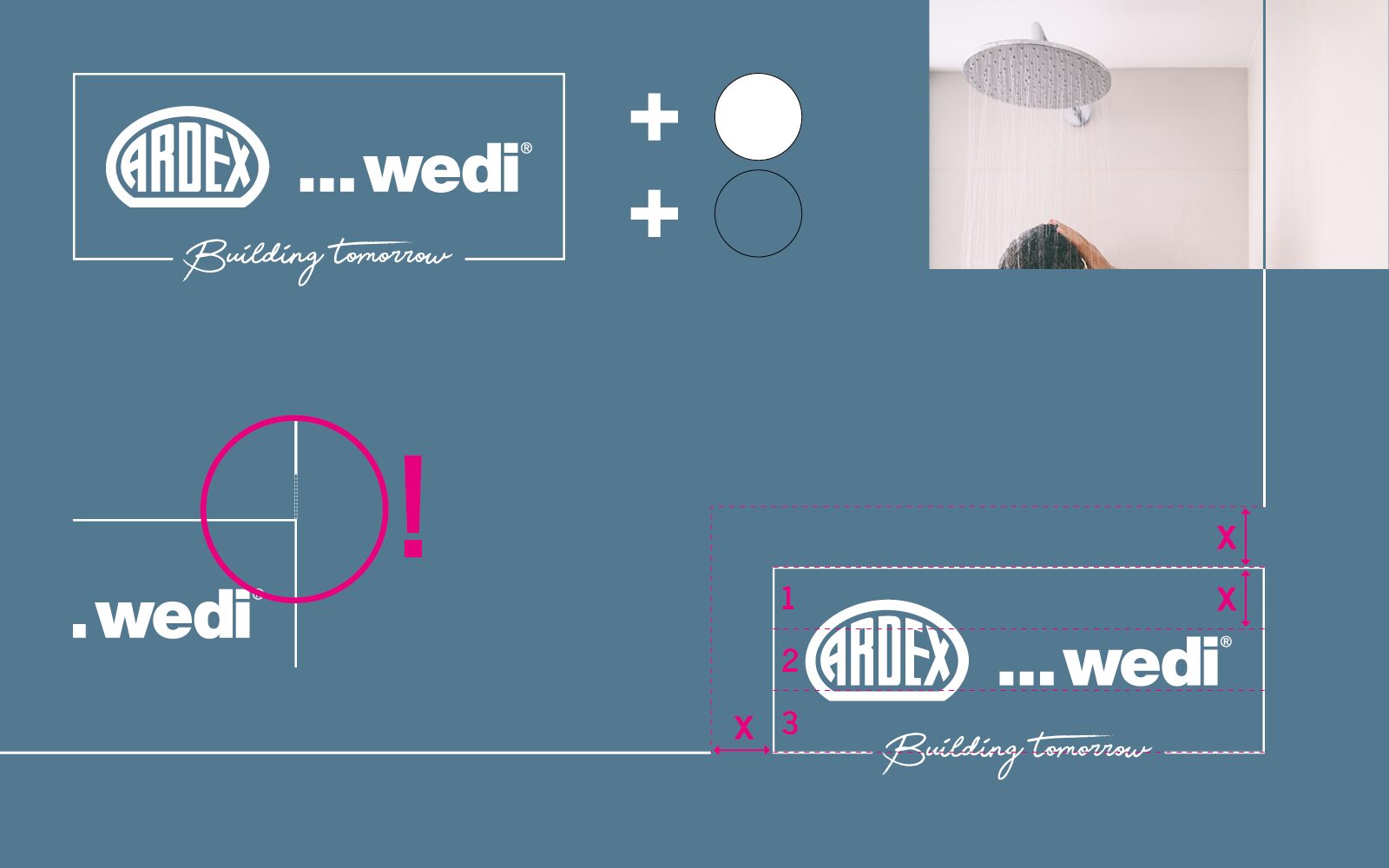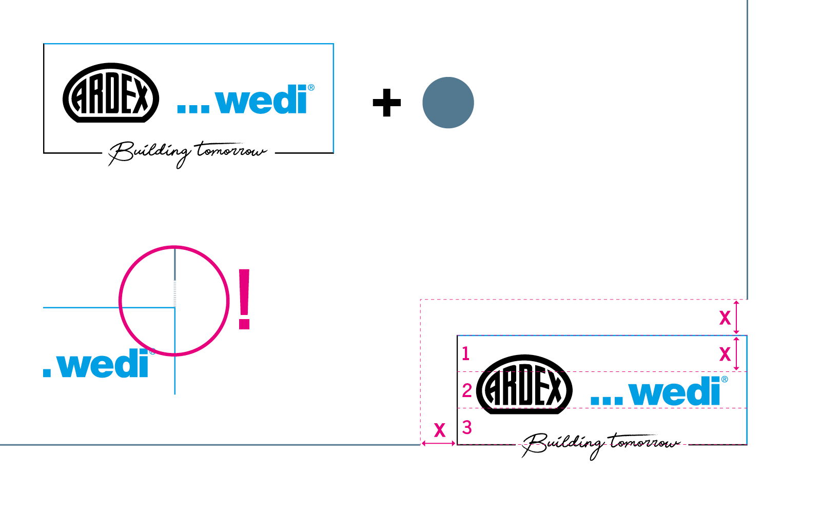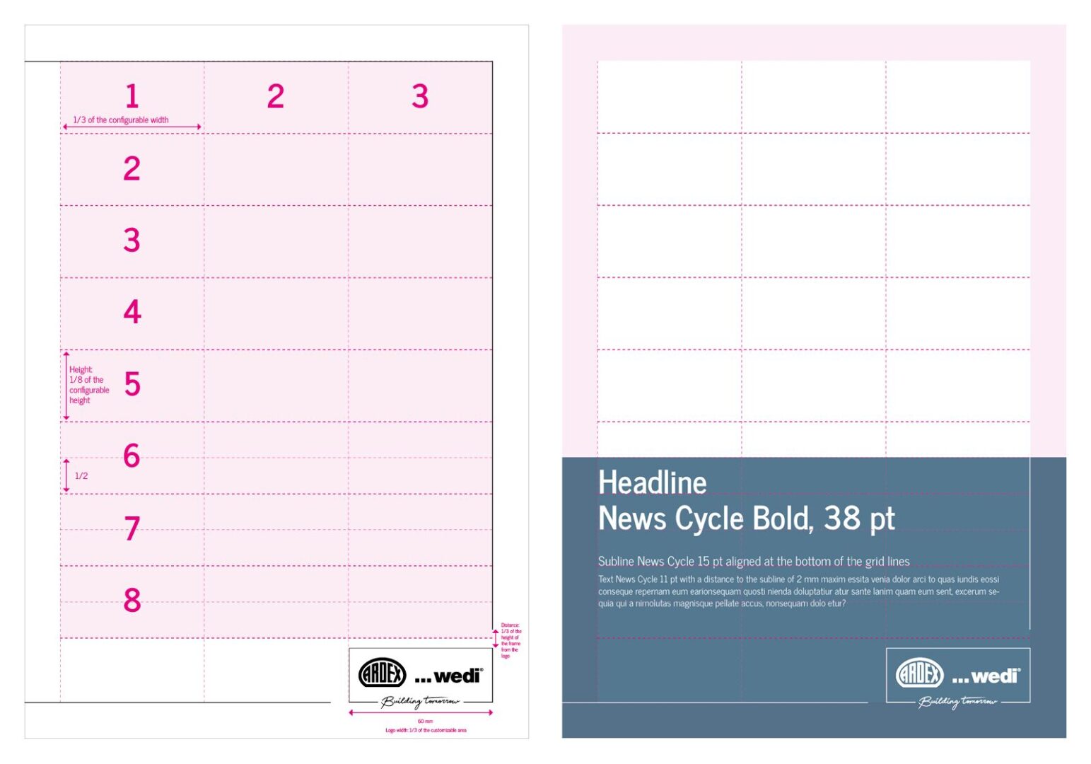 There is a save area of 15 mm all around. The width of the logo corresponds to 1/3 of the design area. The distance between the lines and the logo corresponds to 1/3 of the height of the logo frame. The design area is divided into 8 large areas. In the lower area, these are divided again in half.