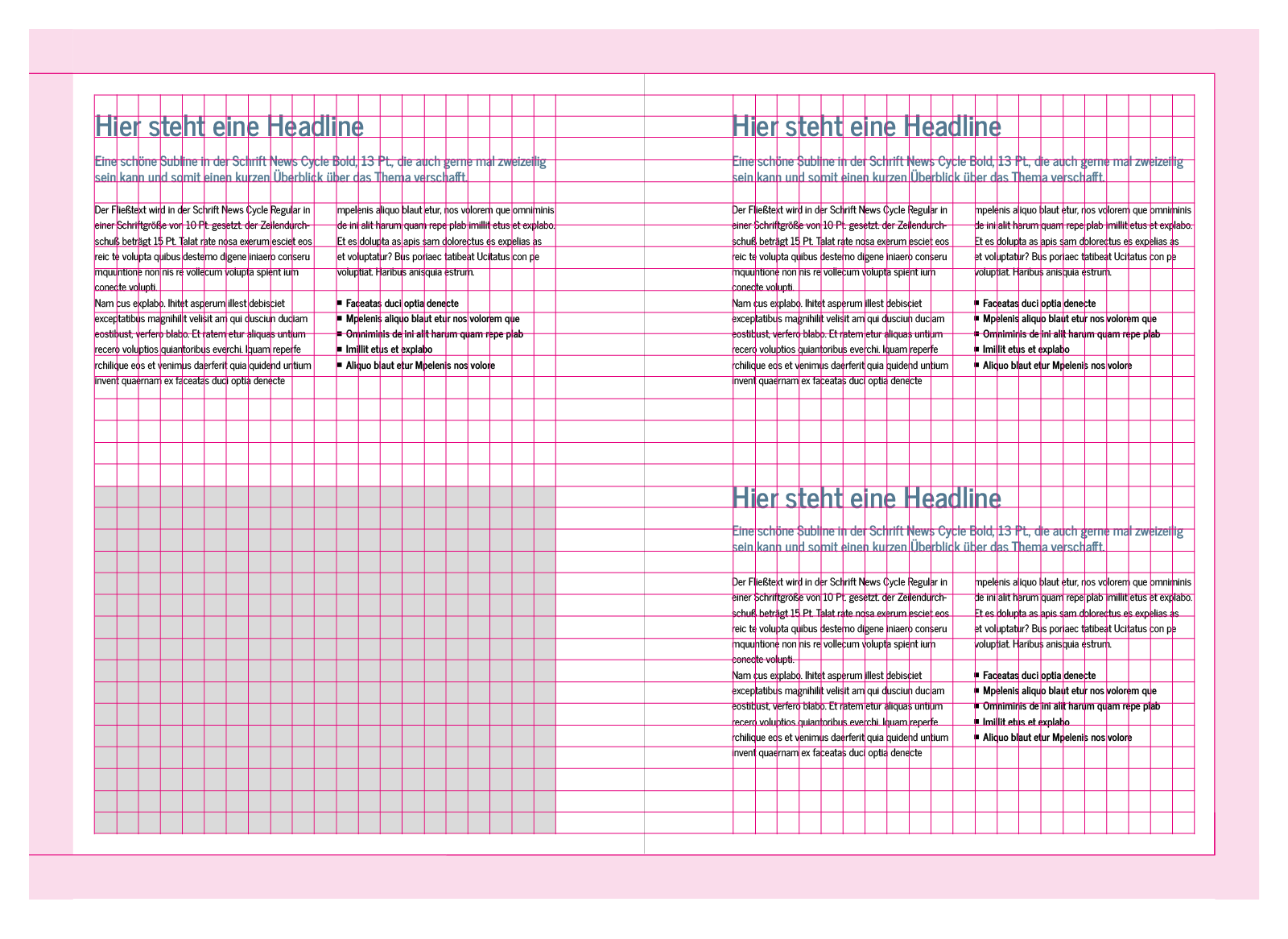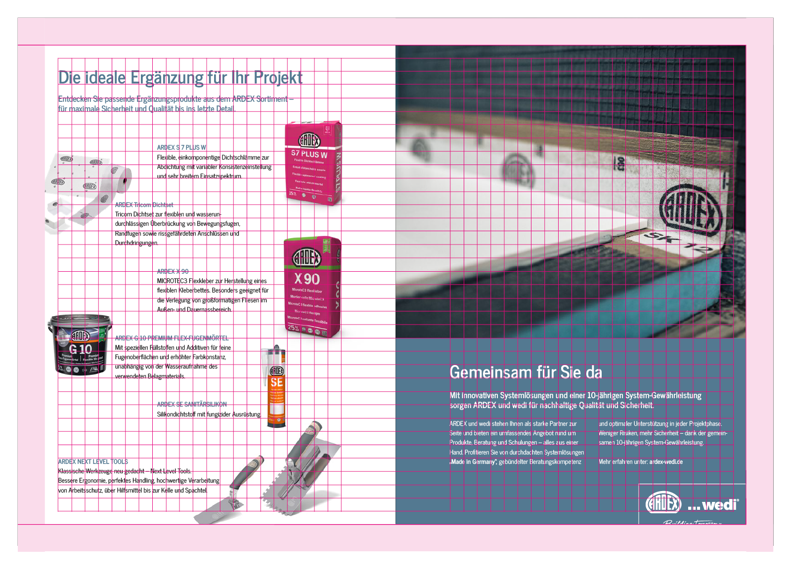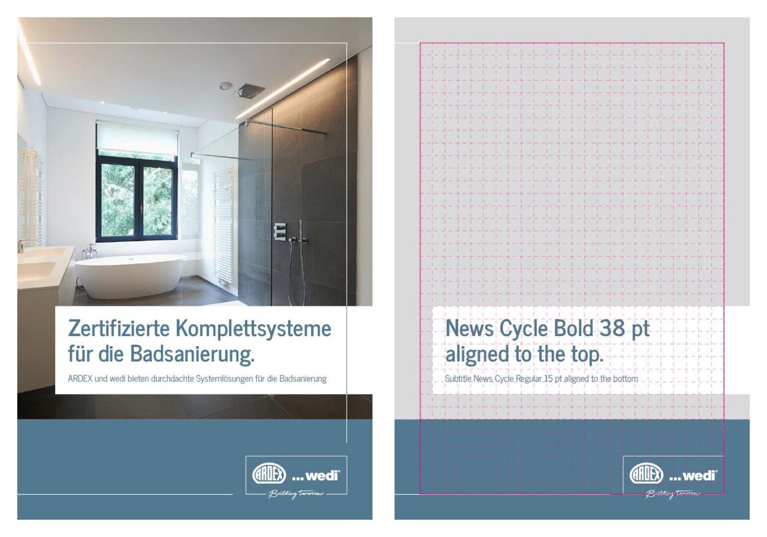 The layout aligns with the grid. The safe space is smaller compared to the brochure, providing more room for text and images.